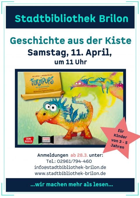 Am Samstag, den 11.04.2026 lädt die Stadtbibliothek Brilon wieder zur gemütlichen Vorlesezeit ein. Um 11 Uhr wird für Kinder im Alter von 3 bis 5 Jahren die Geschichte „Furzipups, der Knatterdrache“ im Holztheater Kamishibai gezeigt.