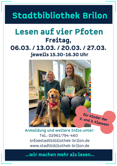 Im März startet ein besonderes Leseförderangebot für Kinder: Unter dem Titel „Lesen auf vier Pfoten“ besucht jeden Freitag im März von 15:30 bis 16:30 Uhr die zertifizierte Vorlesehündin Lotta die Bibliothek. Das Angebot richtet sich an Kinder der 2. und 3. Schulklassen. In ruhiger Atmosphäre haben sie die Möglichkeit, Lotta vorzulesen.