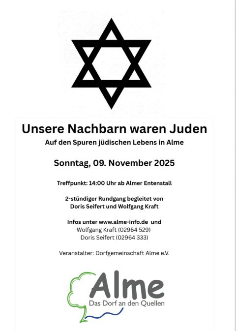 Wir begeben uns während eines ca. 2stündigen Rundgangs zwischen Schloss und Judenknapp, begleitet von Doris Seifert und Wolfgang Kraft, auf Spurensuche nach jüdischem Leben in Alme.
