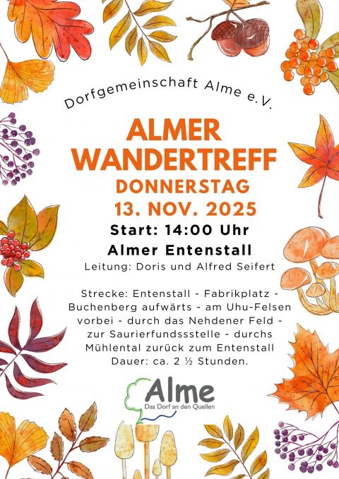 Die Dorfgemeinschaft Alme e.V. lädt am Donnerstag, 13. November 2025 zu einer Wanderung ein. Es geht unter der Führung von Doris und Alfred Seifert vom Entenstall über den Fabrikplatz, den Buchenberg aufwärts, am Uhu-Felsen vorbei durch das Nehdener Feld zur Saurierfundstelle und durchs Mühlental zurück zum Entenstall.
