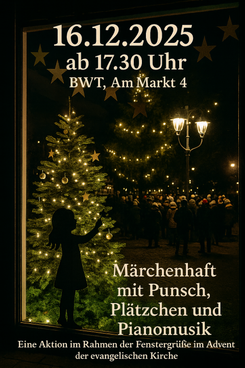 Wie bereits in den vergangenen Jahren ist das Team der BWT wieder mit dabei und gestaltet den Abend am 16.12.2026 . Alle Besucherinnen und Besucher dürfen sich dabei auf etwas ganz Besonderes freuen: Es wird märchenhaft! Doch welches Märchen wohl in diesem Jahr zum Leben erweckt wird? Die Auflösung folgt vor Ort.