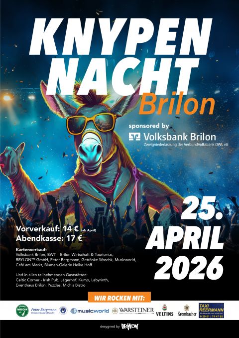 Das Briloner Blasorchester feiert seinen 50. Geburtstag. Um 15 Uhr lädt es ein zu einem stimmungsvollen Platzkonzert auf dem Schulhof der Nikolaikirche, um 17 Uhr zu einem Massenchor und einem großen Festzug durch Brilon. Um 19 Uhr startet die große Party in der Briloner Schützenhalle mit der Cannstatter Wasen Band Partyfürsten.